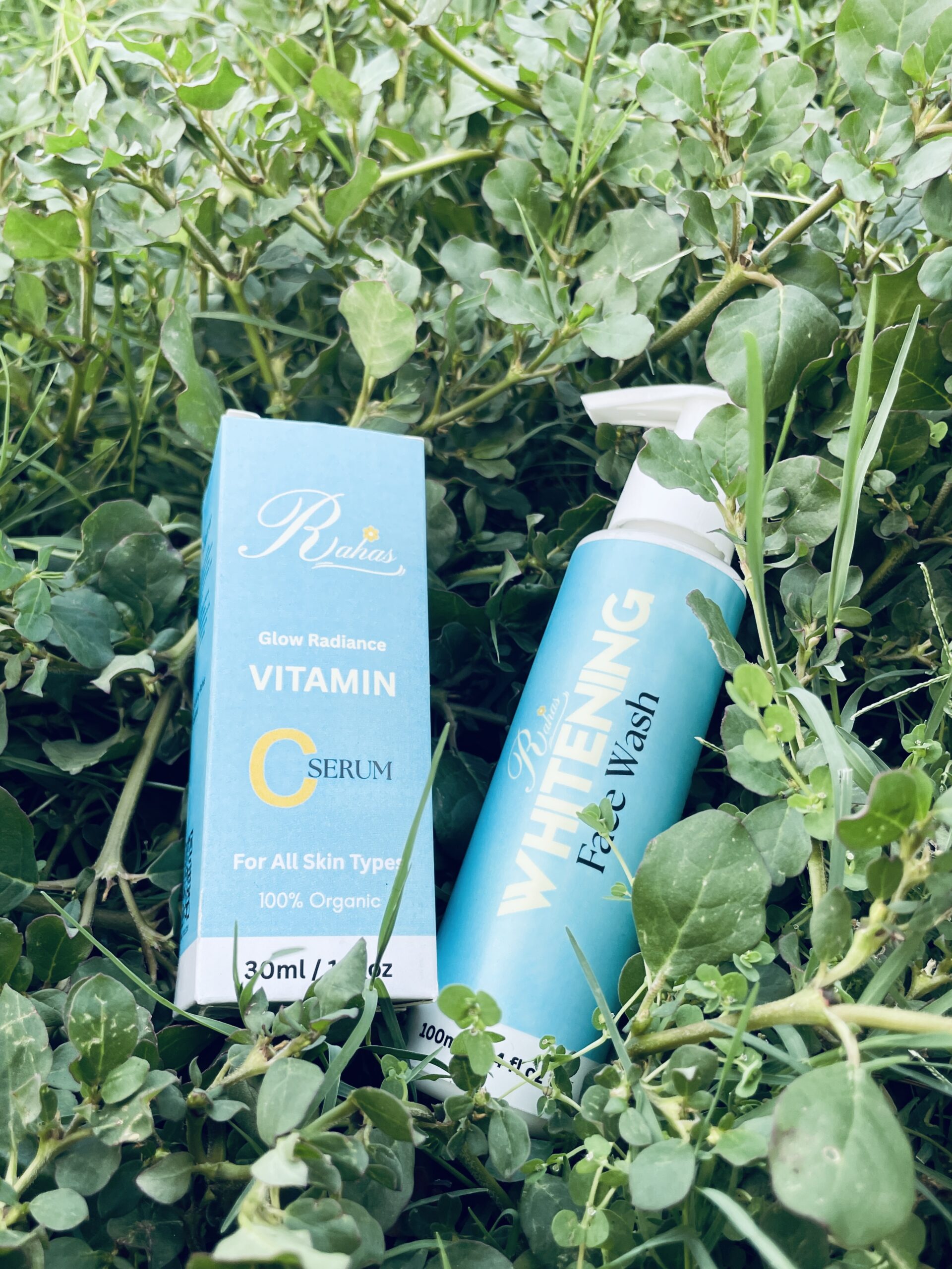 Rahas Glow Radiance Vitamin C Serum (30ml) – Enriched with 100% organic Vitamin C, this serum helps reduce dark spots, boost collagen, and restore natural radiance.